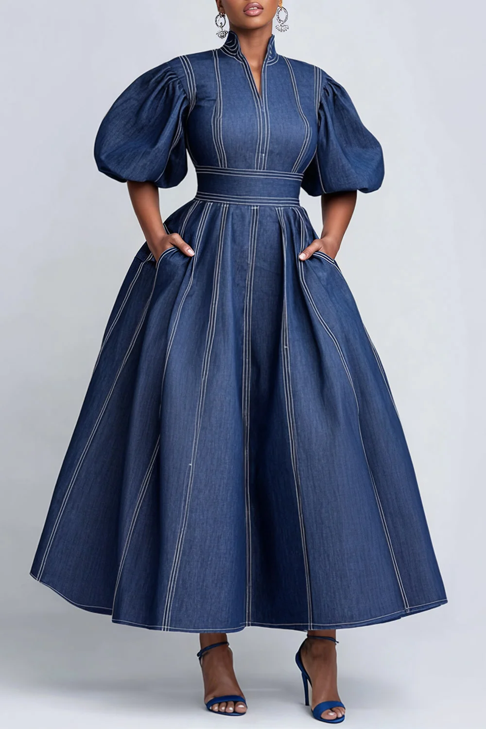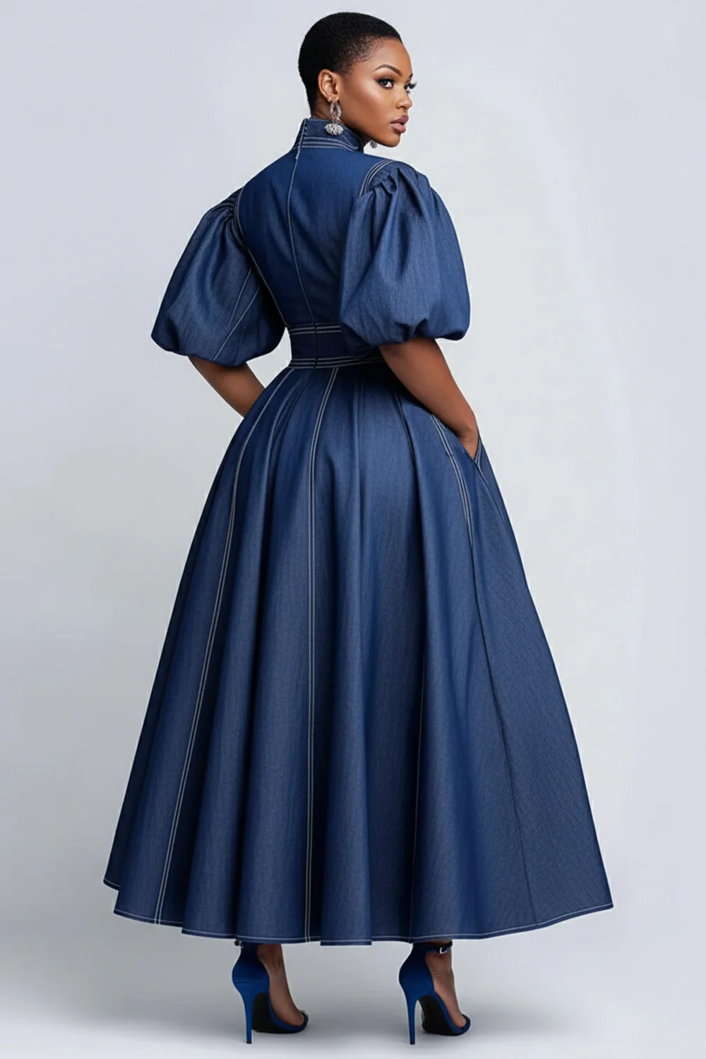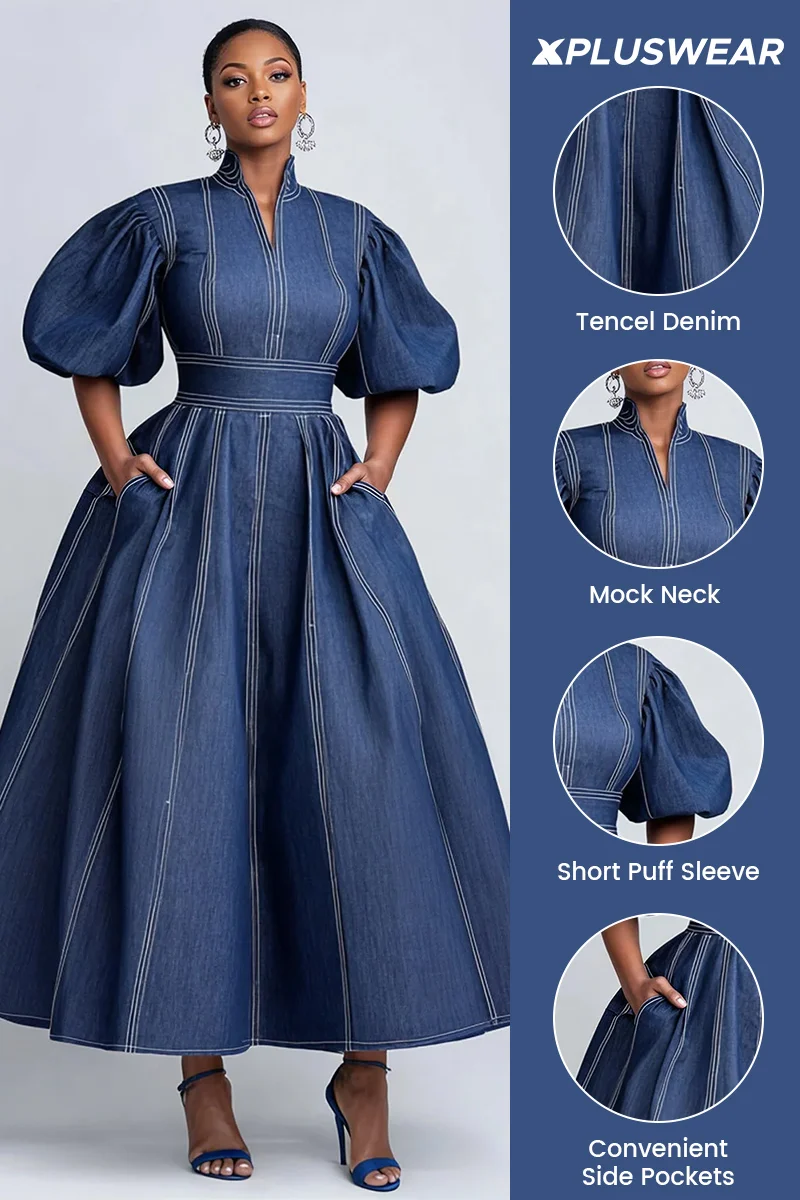 Plus Size Business Casual Blue Mock Neck Puff Sleeve Short Sleeve Pocket Elegant Tencel Denim Midi Dresses