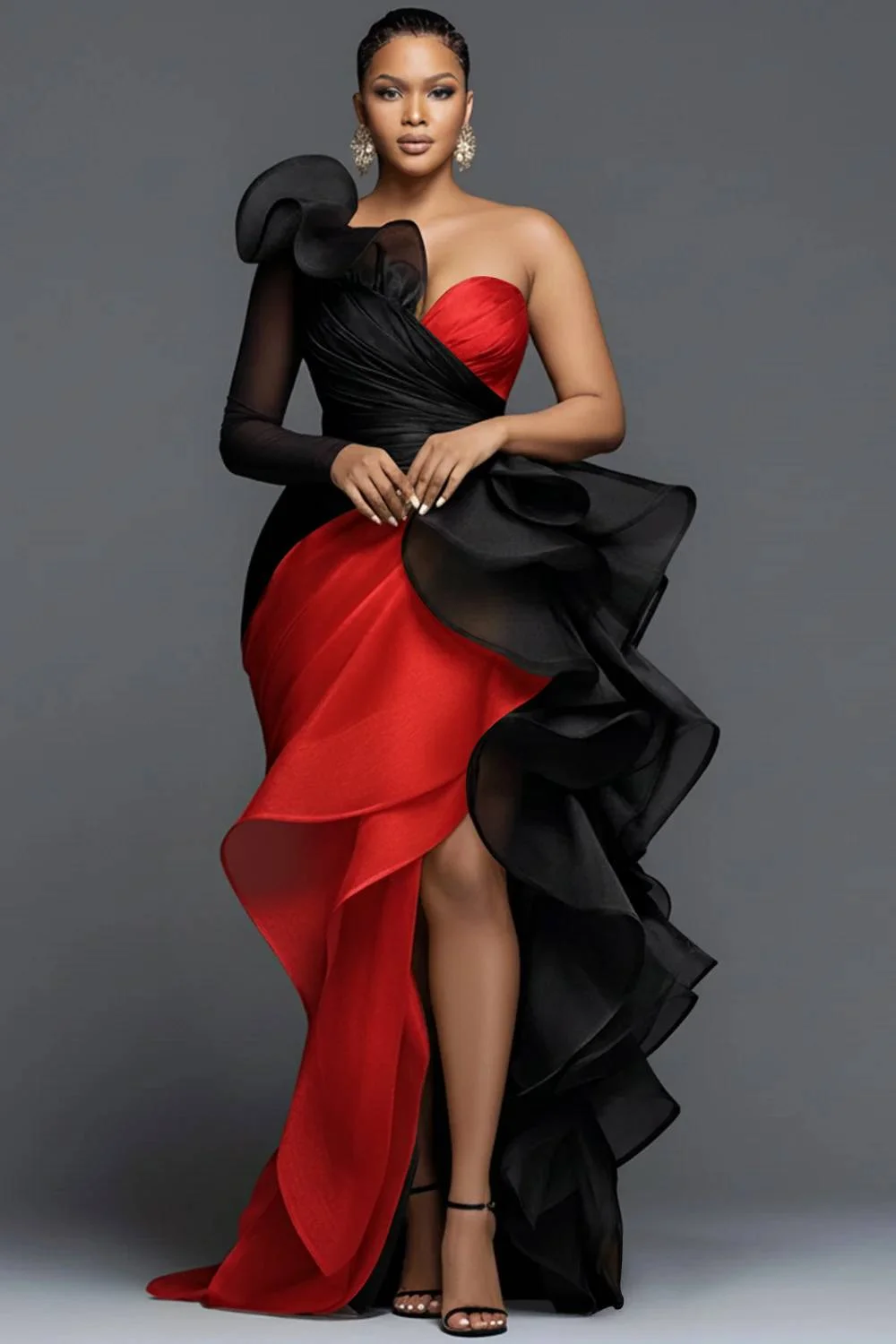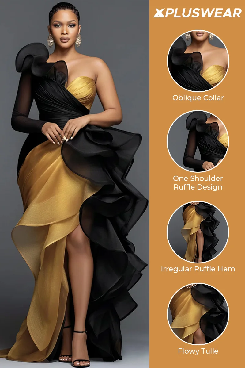 Plus Size Formal Gold Oblique Collar One Shoulder Long Sleeve Ruffle Elegant Asymmetric Hem Irregular Hem Maxi Dresses